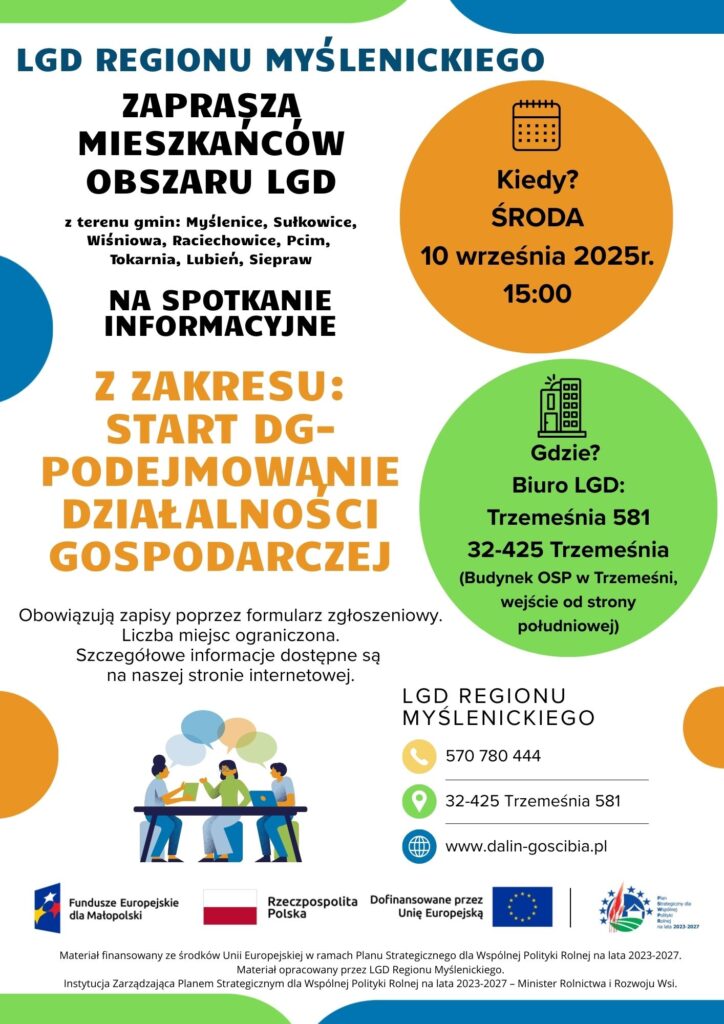 Serdecznie zapraszamy na spotkanie szkoleniowo-informacyjne mieszkańców obszaru działania LGD Regionu Myślenickiego, tj. gmin: Myślenice, Sułkowice, Wiśniowa, Raciechowice, Pcim, Tokarnia, Lubień, Siepraw.